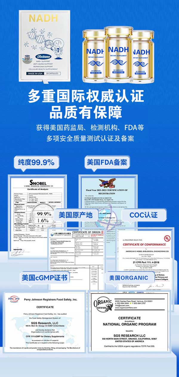 彩虹基因 的NADH胶囊还是目前国际上首个从提纯工艺,生产都被美国药监局认证的NADH产品。获得了国际级别的GMP认证,从原料采集到成品制作经过100多道工序,全程参与300多项品控检测,绝对是可以安心放心服用。